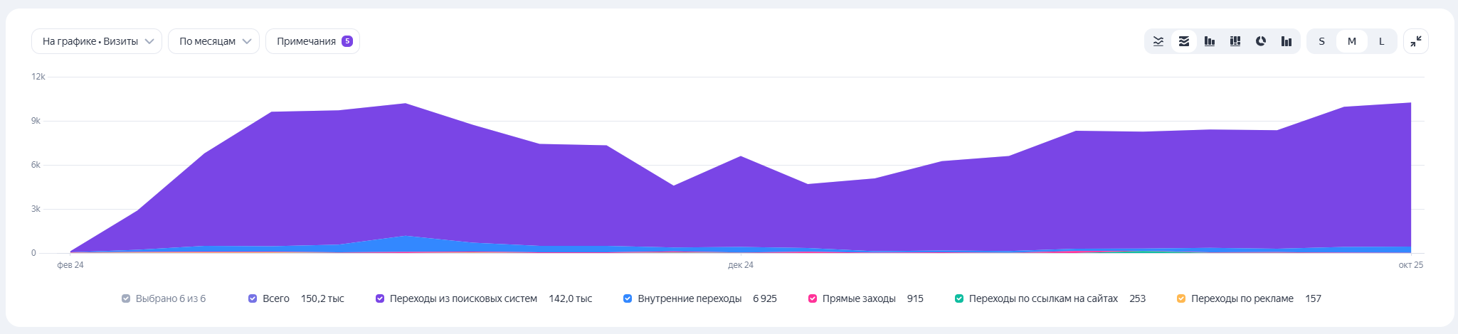 После разработки сайта была сформирована структура под поисковые запросы, выполнена базовая оптимизация и начата системная работа по продвижению.